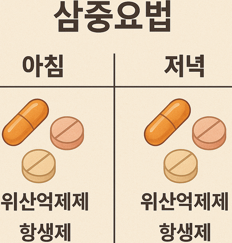 이를 삼중요법이라고 하며, 치료 성공률은 약 70-90%에 달합니다.